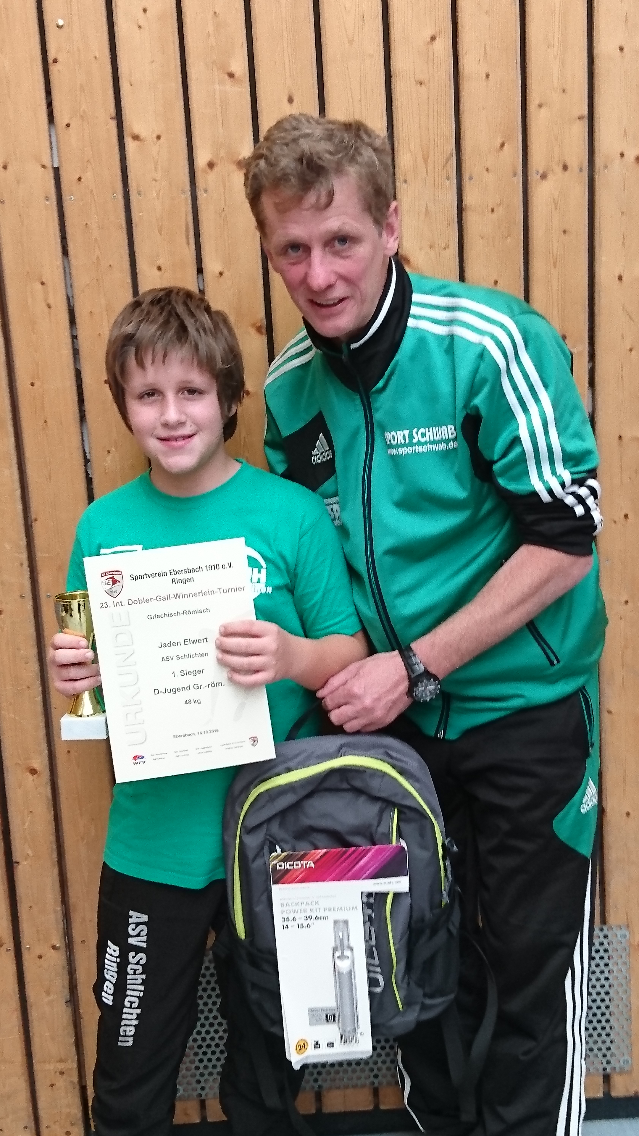 Am vergangenen Sonntag wurde in Ebersbach bereits zum 23. Mal das internationale Dobler-Gall-Winnerlein-Gedächtnisturnier ausgetragen. 200 Teilnehmer kämpften auf vier Matten um den Turniersieg. Für den ASV Schlichten ging Jaden Elwert bei der D-Jugend in der Gewichtsklasse bis 48 kg im griechisch-römischen Stil auf die Matte. Jaden konnte alle Kämpfe ohne Punktverlust mit einem Schultersieg beenden und errang so völlig verdient seinen ersten Turniersieg in Ebersbach. Alle Erstplatzierten erhielten zusätzlich zum Siegerpokal noch einen Rucksack.